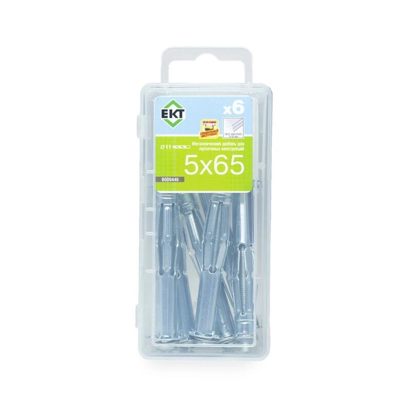 Металлический дюбель для крепления в пустотелых конструкциях и листовых материалах: гипсокартон, ДСП, газобетонные блоки. Изготовлен из оцинкованной стали. Диаметр: 5 мм, длина: 65 мм. В упаковке: 6 шт.
