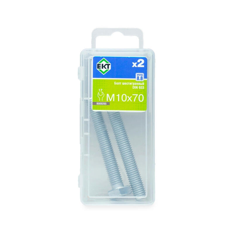 Болт шестигранный оцинкованный, прочность 8.8, стандарт DIN 933. Размер: диаметр резьбы 10 мм, длина 70 мм. Материал: конструкционная сталь с цинковым покрытием. Упаковка: 2 штуки.