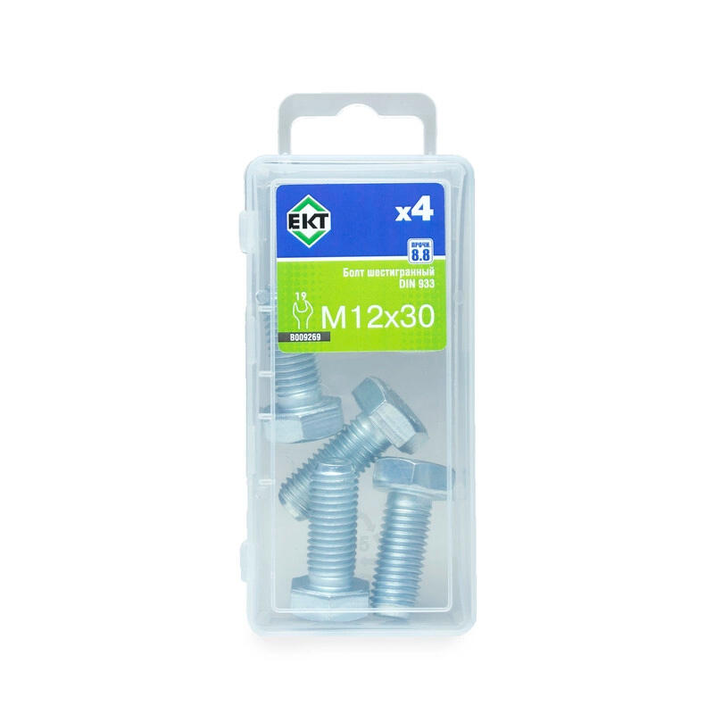Болт шестигранный оцинкованный 12х30 мм с полной метрической резьбой, класс прочности 8.8. Изготовлен из конструкционной стали по стандарту DIN 933. Упаковка содержит 4 шт.
