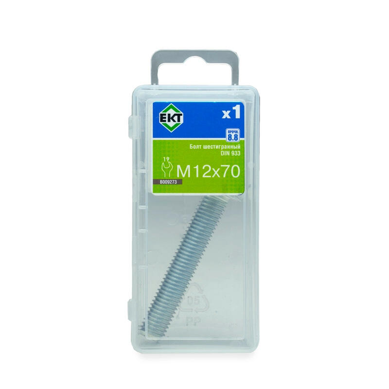 Болт шестигранный DIN 933 с полной метрической резьбой М12х70 мм. Изготовлен из оцинкованной конструкционной стали, класс прочности 8.8. Бренд: ЕКТ. Производитель: ООО «ЕКТ Компани», Беларусь. Упаковка: 1 шт.