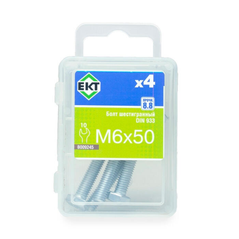 Болт шестигранный оцинкованный М6х50 мм, класс прочности 8.8. Соответствует стандартам DIN 933 и ГОСТ 7798-70. Представляет собой стальной стержень с метрической резьбой и шестигранной головкой под ключ. Упаковка содержит 4 штуки.