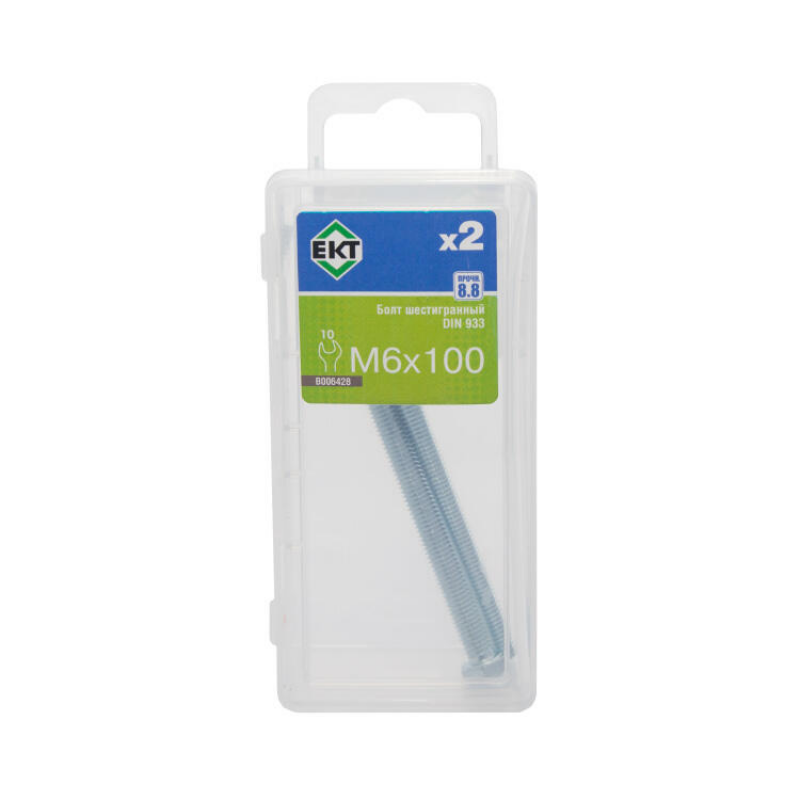 Болт шестигранный оцинкованный, прочность 8.8 по DIN 933. Диаметр резьбы 6 мм, длина 100 мм. Материал: оцинкованная сталь. Упаковка содержит 2 штуки.