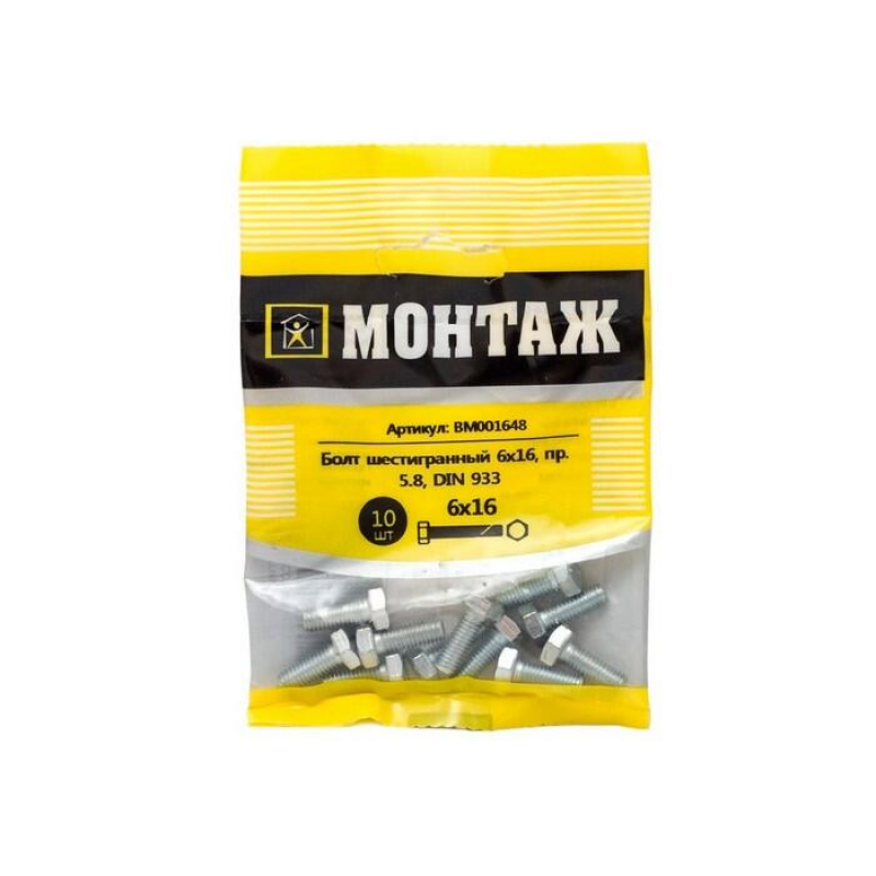 Болт шестигранный оцинкованный 6х16 мм, класс прочности 5.8, стандарт DIN 933. Цилиндрический стержень с наружной резьбой и шестигранной головкой под ключ. Диаметр резьбы: 6 мм, длина: 16 мм. Упаковка: 10 шт. Материал: оцинкованная сталь. Производитель: ООО «ЕКТ Компани», Беларусь.