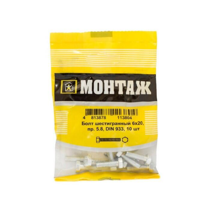 Болт шестигранный DIN 933, сталь оцинкованная. Диаметр резьбы: 6 мм. Длина: 20 мм. Класс прочности: 5.8. Упаковка: 10 шт.