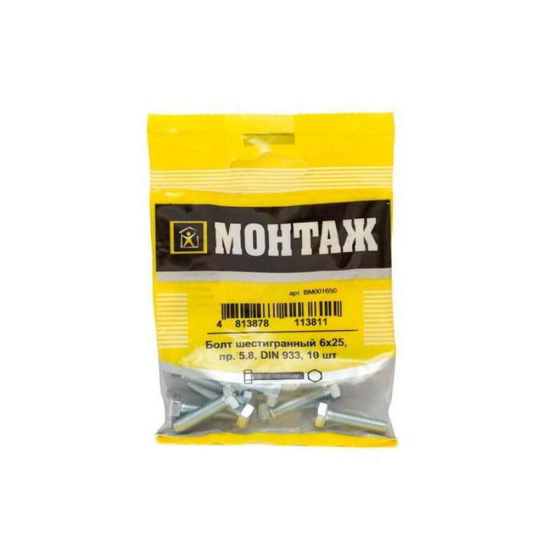 Болт шестигранный МОНТАЖ 6x25 мм из оцинкованной стали. Класс прочности 5.8, соответствует стандарту DIN 933. Упаковка содержит 10 штук. Произведен в Беларуси.