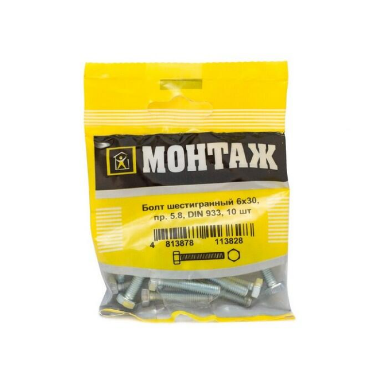 Болт шестигранный МОНТАЖ, оцинкованный. Диаметр: 6 мм. Длина: 30 мм. Класс прочности: 5.8. Соответствует стандарту DIN 933. Материал: оцинкованная сталь. Упаковка: 10 штук. Производитель: ООО «ЕКТ Компани», Беларусь.