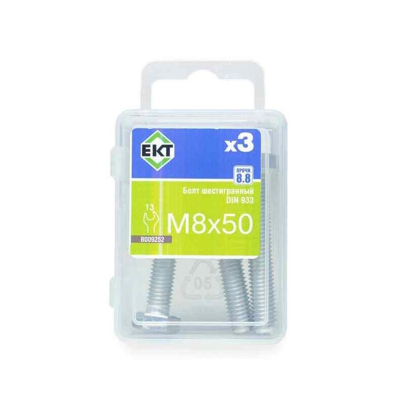 Болт шестигранный M8x50 мм, оцинкованный, класс прочности 8.8. Соответствует стандартам DIN 933 и ГОСТ 7798-70. В упаковке 3 шт. Бренд: ЕКТ. Произведено в Беларуси.
