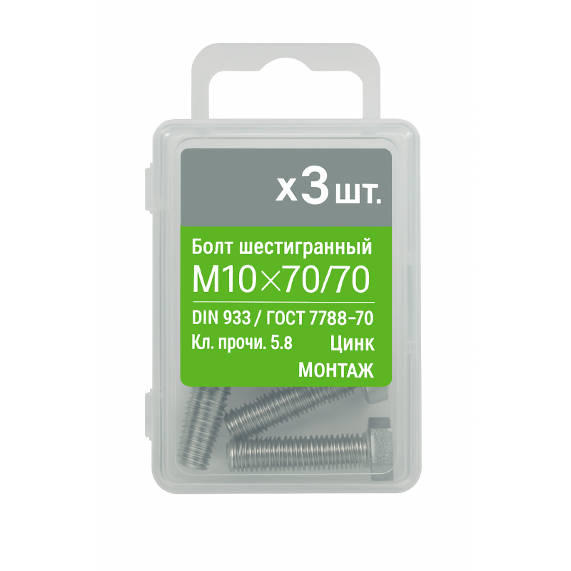 Болт шестигранный М10х70 класса прочности 5.8 с цинковым покрытием. Соответствует стандартам DIN 933 и ГОСТ 7798-70. Упаковка содержит 3 штуки. Произведен ОАО «Речицкий метизный завод» (Беларусь).
