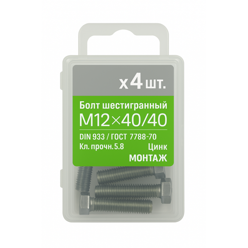 Болт шестигранный М12х40 мм, класс прочности 5.8, с цинковым покрытием. Соответствует стандартам DIN933 и ГОСТ 7798-70. Произведен ОАО «Речицкий метизный завод» (Беларусь). Упаковка: 4 шт.