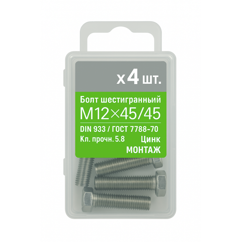 Болт шестигранный М12х70 мм, класс прочности 5.8, с цинковым покрытием. Соответствует стандартам DIN 933 и ГОСТ 7798-70. Упаковка содержит 10 штук. Произведен ОАО «Речицкий метизный завод» (Беларусь).
