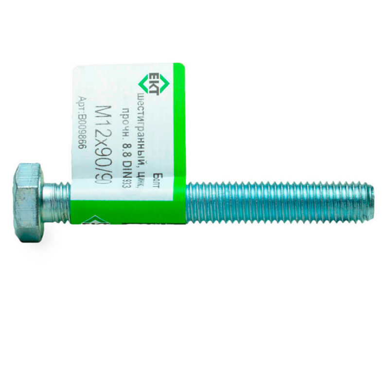 Болт шестигранный М12х90 класса прочности 8.8. Изготовлен из оцинкованной стали. Соответствует стандартам ГОСТ 7798-70 и DIN 933. Диаметр резьбы 12 мм, длина 90 мм. Вес единицы: 0.082 кг.