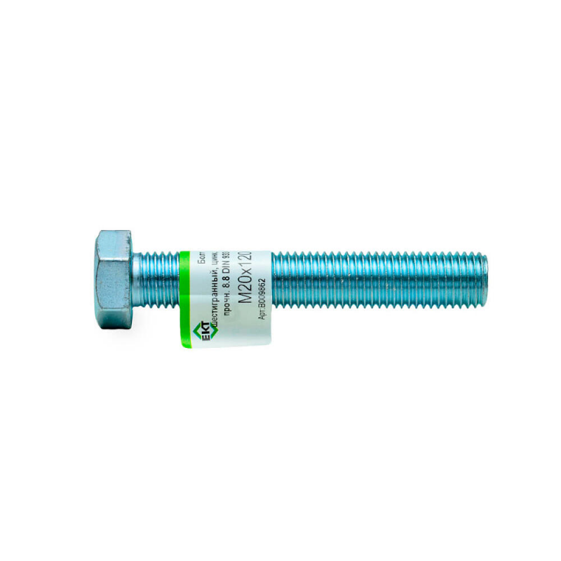 Болт шестигранный М20х120 из оцинкованной стали, класс прочности 8.8, стандарт DIN933. Бренд ЕКТ. Индивидуальная упаковка (1 шт).