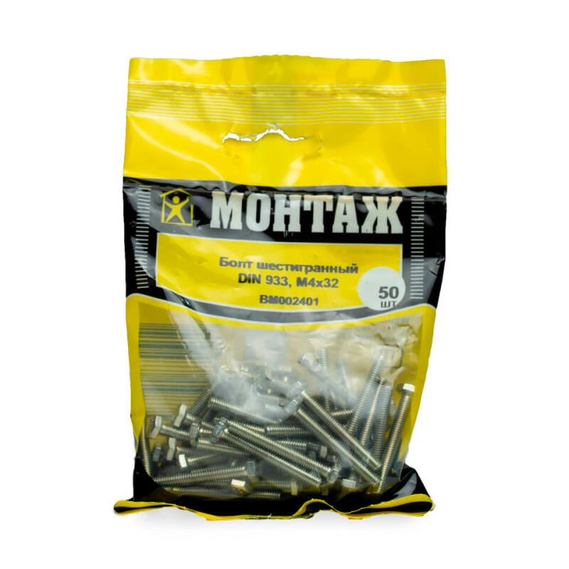 Болт шестигранный М4х32 из оцинкованной стали, класс прочности 8.8. Соответствует стандарту DIN 933. Упаковка содержит 50 штук.