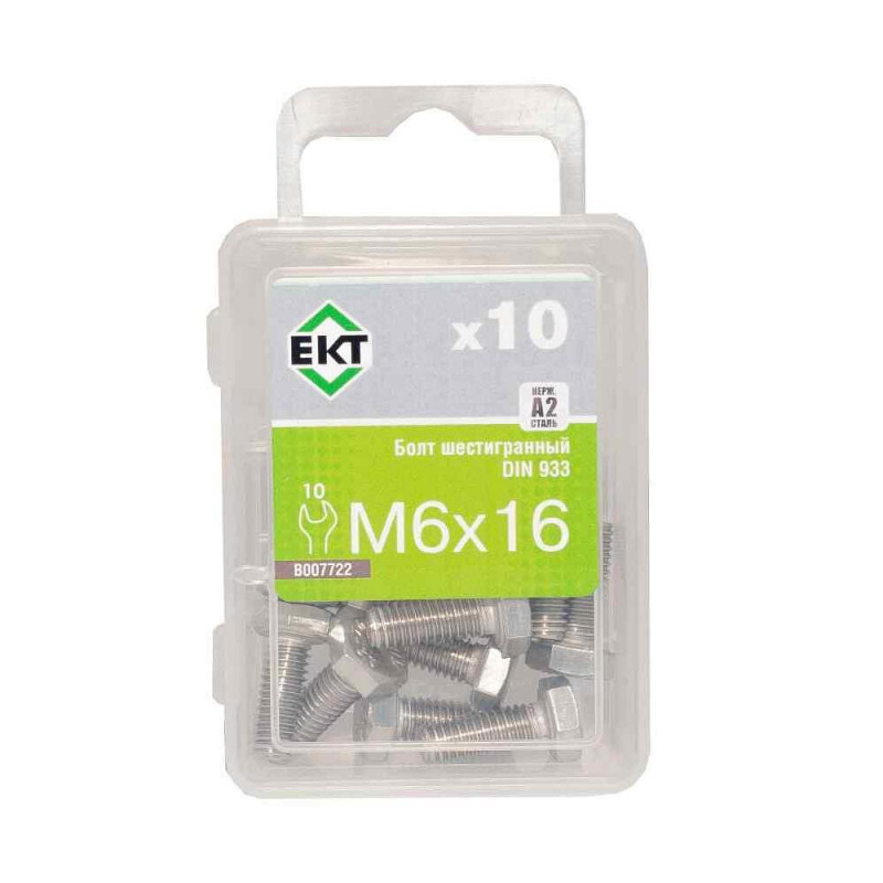 Болт шестигранный M6х16 из нержавеющей стали. Класс прочности 8.8. Соответствует стандарту DIN 933. Упаковка: 10 штук. Вес упаковки: 0.053 кг. Производитель: ООО «ЕКТ Компани», Германия.