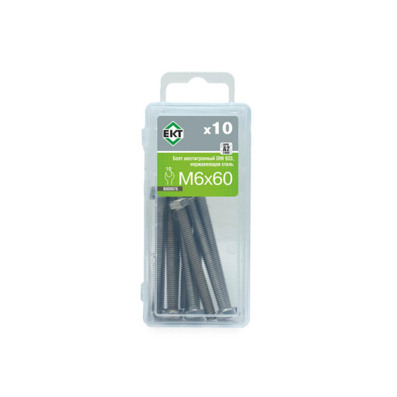 Болт шестигранный M6x60 мм, стандарт DIN933, нержавеющая сталь. Упаковка: 10 шт.