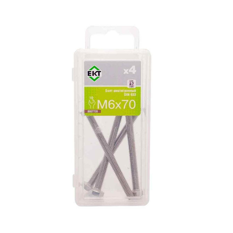 Болт с шестигранной головкой M6х70, стандарт DIN 933. Изготовлен из нержавеющей стали, класс прочности 8.8. Упаковка содержит 4 шт.