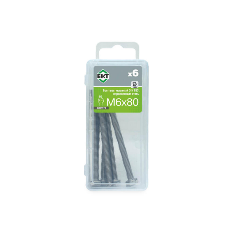 Набор из 6 шестигранных болтов M6х80, соответствующих стандарту DIN933. Изготовлены из нержавеющей стали. Бренд: ЕКТ.