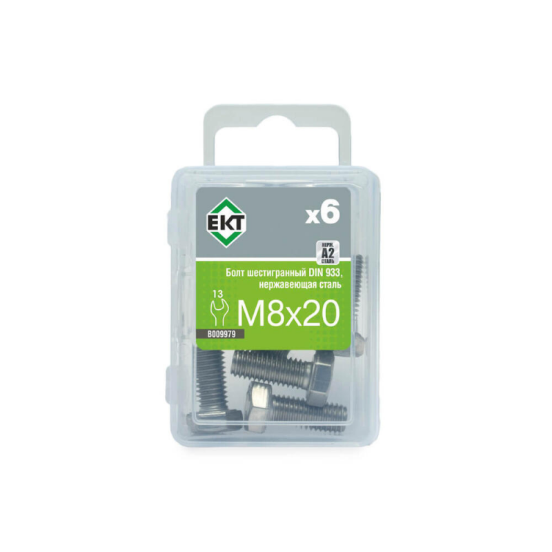 Набор из 6 шестигранных болтов M8x20 мм, изготовленных из нержавеющей стали. Соответствует стандарту DIN 933. Упаковка весом 0.086 кг.