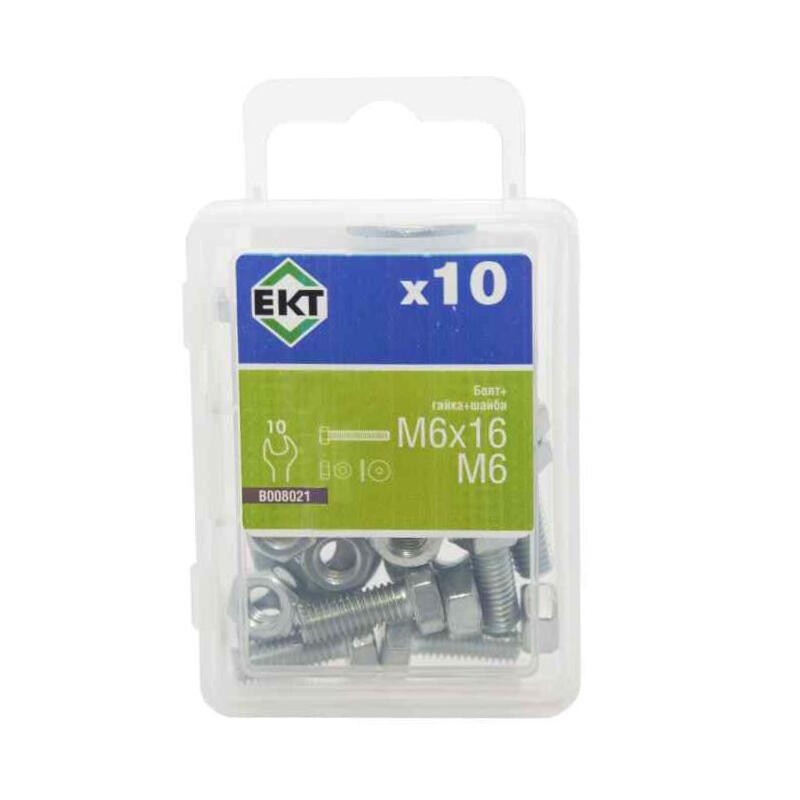 Болт шестигранный M6x16, DIN933, класс прочности 5.8, оцинкованный. В комплекте: гайка М6, усиленная шайба М6. Упаковка: 10 шт. Бренд: ЕКТ. Производитель: ООО «ЕКТ Компани», Китай.