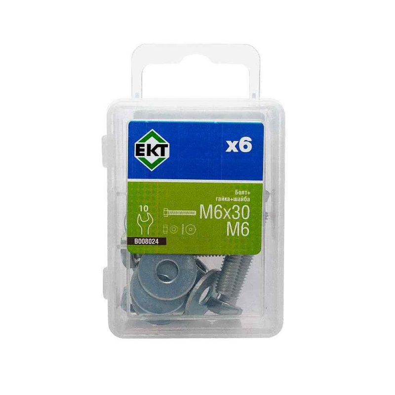 Комплект крепежа: шестигранный болт M6x30 по DIN 933, гайка М6, усиленная шайба М6. Изготовлен из оцинкованной конструкционной стали, класс прочности 5.8. Упаковка содержит 6 комплектов.