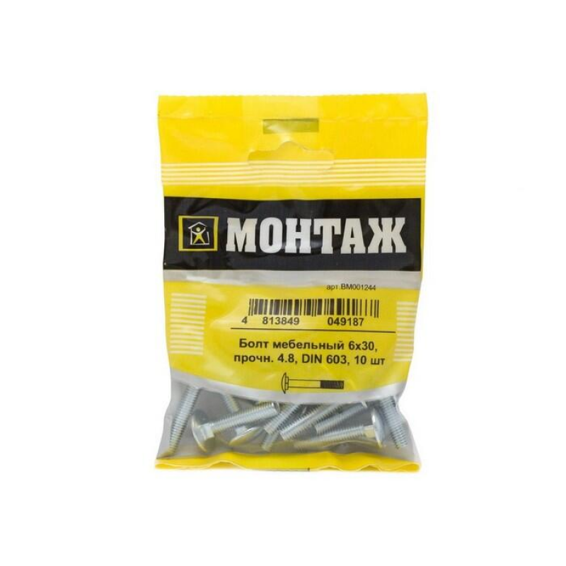 Мебельный болт размером 6х30 мм из оцинкованной стали. Класс прочности 4.8 по стандарту DIN 603. Упаковка: 10 штук.