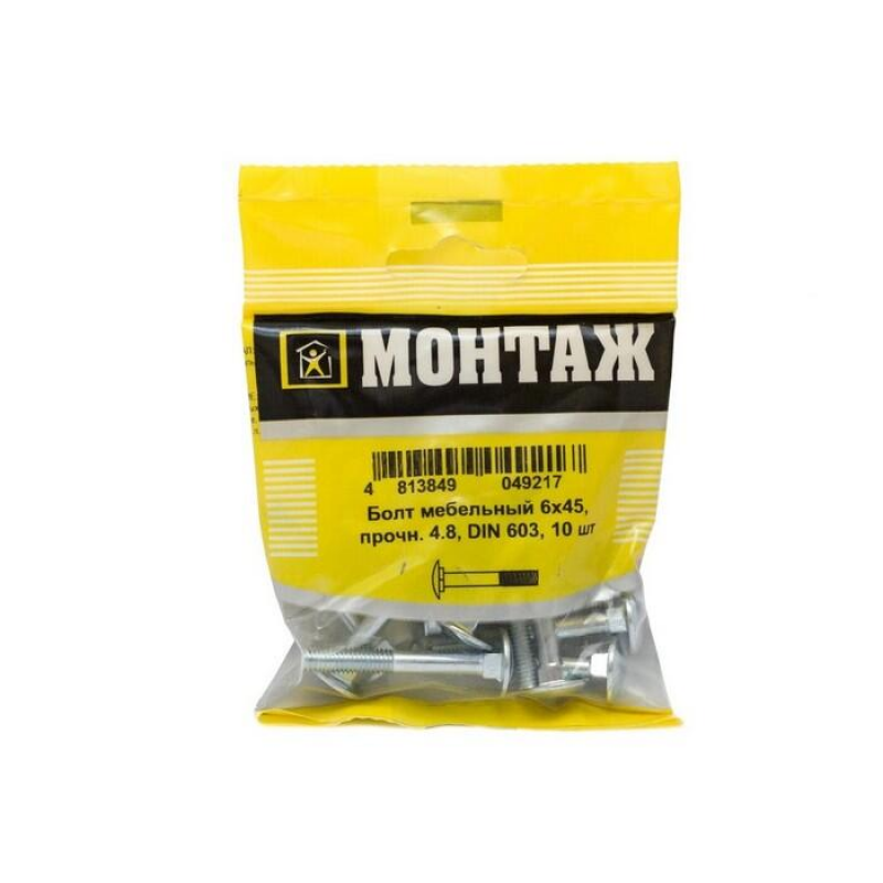 Болт мебельный DIN 603, оцинкованный. Диаметр резьбы: 6 мм. Длина: 45 мм. Класс прочности: 4.8. Количество в упаковке: 10 шт.
