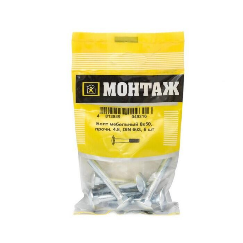 Мебельный болт из оцинкованной стали размером 8х50 мм. Класс прочности 4.8, соответствует стандарту DIN 603. Упаковка содержит 6 штук.