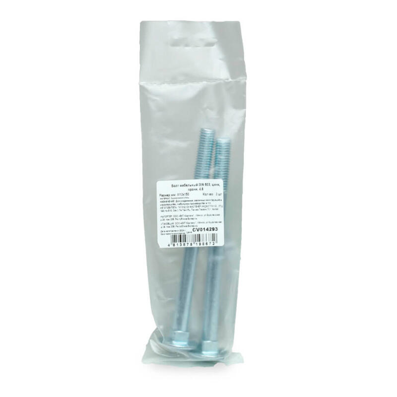 Мебельный болт М12х150 из оцинкованной стали, класс прочности 4.8, соответствует стандарту DIN 603. Упаковка содержит 2 штуки. Производитель: T&C Fastener Industry Co., Ltd (Китай).