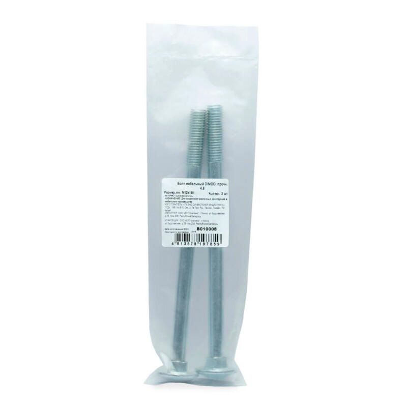 Болт мебельный М12х180. Изготовлен из оцинкованной стали, класс прочности 4.8. Соответствует стандарту DIN 603. Упаковка содержит 2 штуки.
