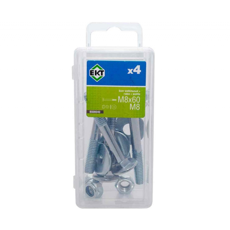 Болт мебельный M8х60 DIN603 в комплекте с гайкой с контргайкой и усиленной шайбой. Оцинкованная сталь. Упаковка: 4 комплекта.