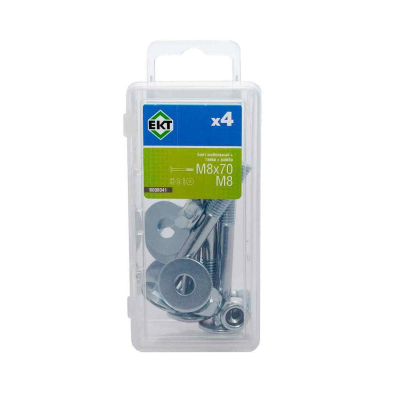Болт мебельный M8x70 DIN603 из оцинкованной стали. Комплектуется гайкой с контргайкой и усиленной шайбой M8. Упаковка: 4 шт.