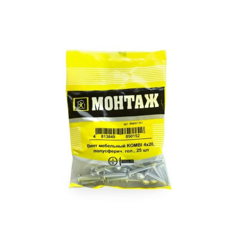 Мебельный винт KOMBI 4х20 мм из оцинкованной стали с комбинированным шлицем. Упаковка содержит 25 штук.