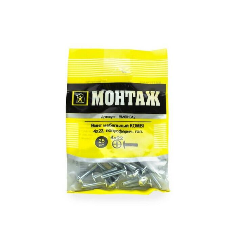 Мебельный винт 4х22 мм с комбинированным шлицем. Изготовлен из оцинкованной стали. Упаковка содержит 25 штук.