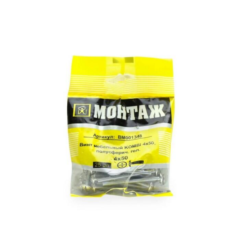 Мебельный винт диаметром 4 мм и длиной 50 мм из оцинкованной стали. Комбинированный шлиц. Упаковка содержит 25 штук. Производитель: ООО «ЕКТ Компани», Китай.
