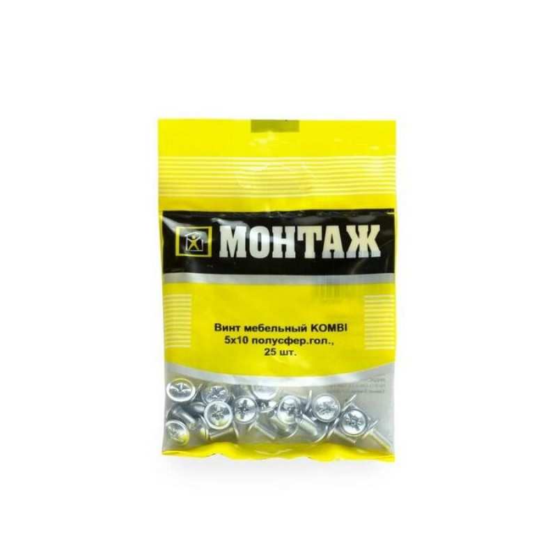 Мебельный винт диаметром 5 мм, длиной 10 мм из оцинкованной стали. Комбинированный шлиц KOMBI. Упаковка содержит 25 штук.