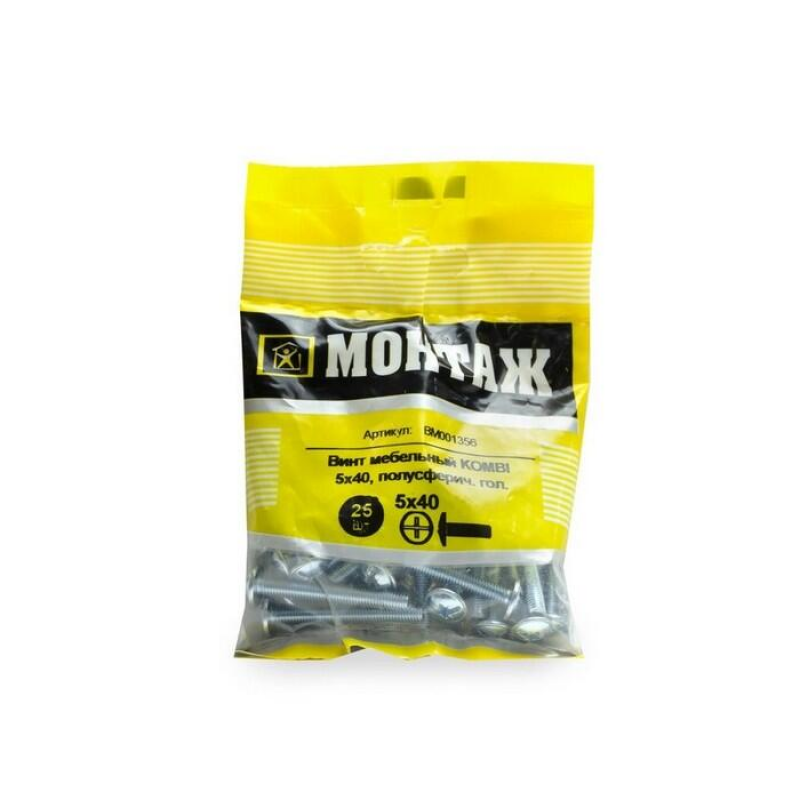 Мебельный винт из оцинкованной стали. Диаметр резьбы: 5 мм. Длина: 40 мм. Тип шлица: комбинированный (KOMBI). Упаковка: 25 шт.
