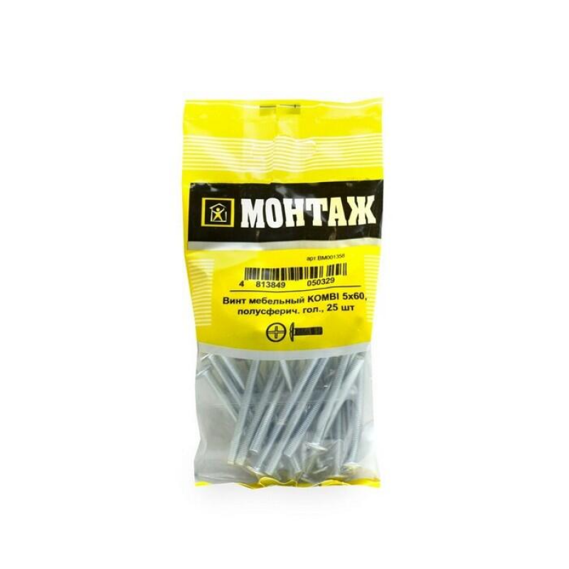 Мебельный винт длиной 60 мм с диаметром резьбы 5 мм. Изготовлен из оцинкованной стали с комбинированным шлицем. Упаковка содержит 25 штук.