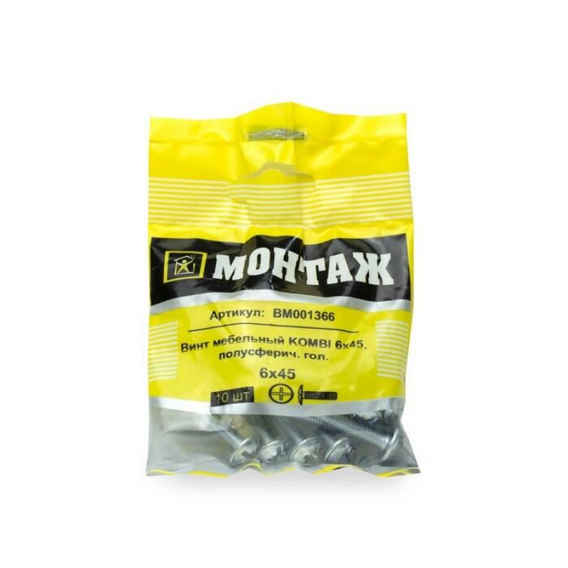 Мебельный винт KOMBI из оцинкованной стали. Диаметр резьбы: 6 мм. Длина: 45 мм. Комбинированный шлиц. Упаковка: 10 штук.