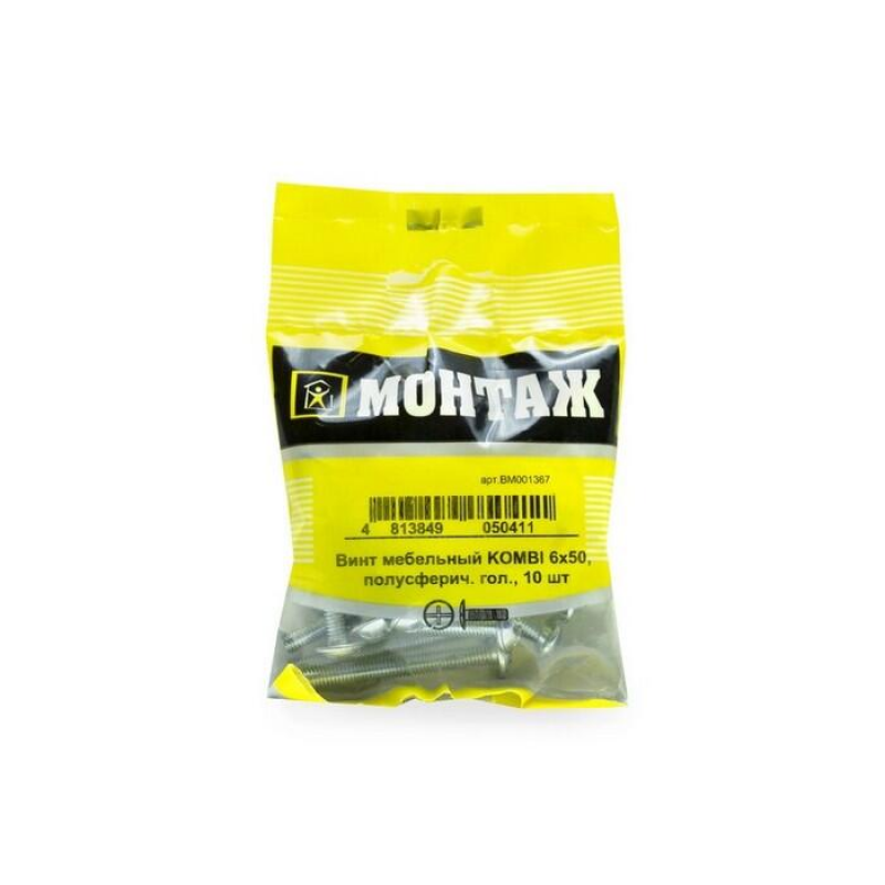 Мебельный винт длиной 50 мм с диаметром резьбы 6 мм. Изготовлен из оцинкованной стали, имеет комбинированный шлиц. Упаковка содержит 10 штук.