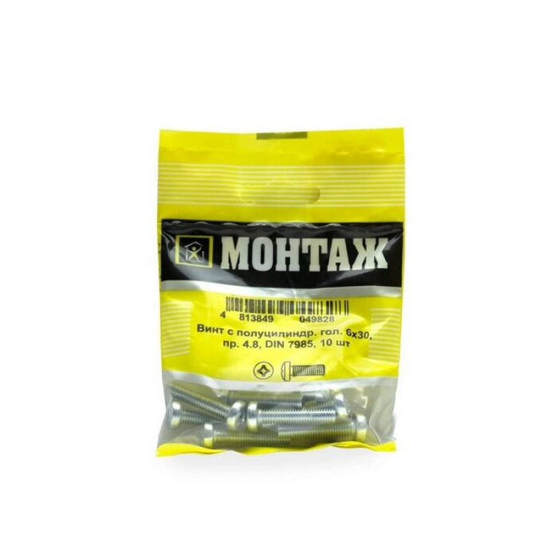 Винт полуцилиндрический, оцинкованная сталь. Размер: 6х30 мм. Шлиц Phillips. Класс прочности 4.8 по DIN 7985. Упаковка: 10 шт.