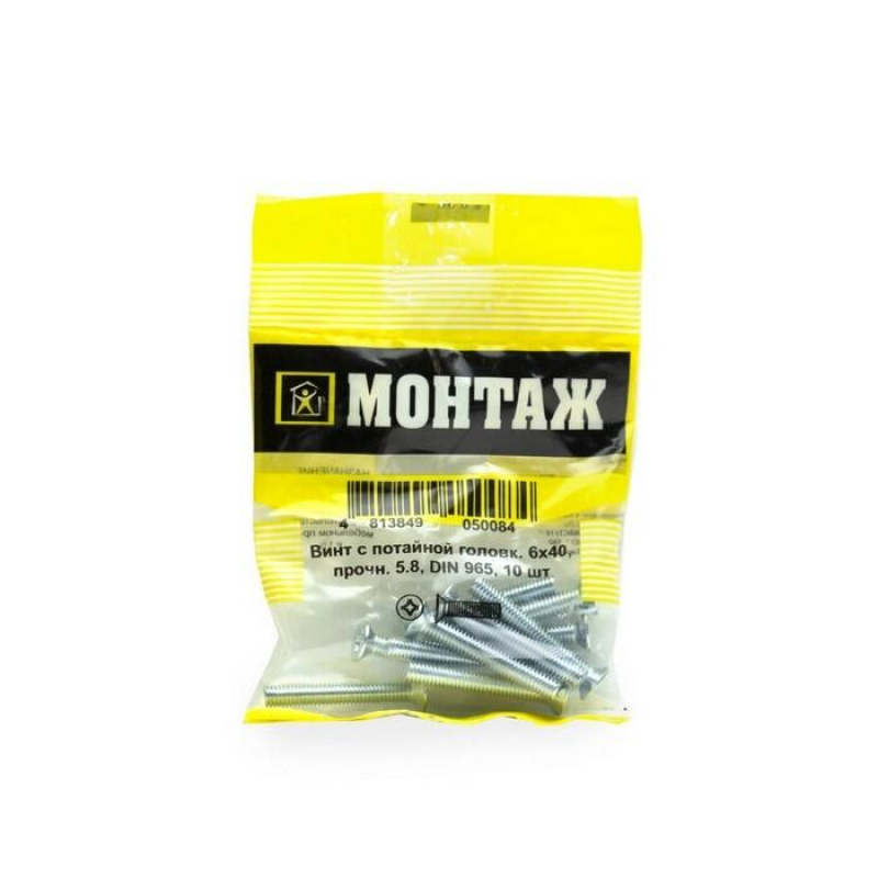 Винт потайной DIN 965, размер 6х40 мм. Изготовлен из оцинкованной стали класса прочности 5.8. Головка типа потай со шлицем Pozidriv. Упаковка: 10 штук.