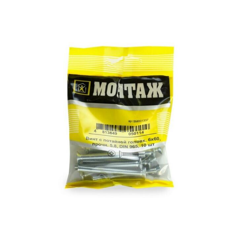 Винт с потайной головкой 6х60 мм, цинковое покрытие, класс прочности 5.8, стандарт DIN 965. Упаковка: 10 шт. Полное утопление головки при монтаже.