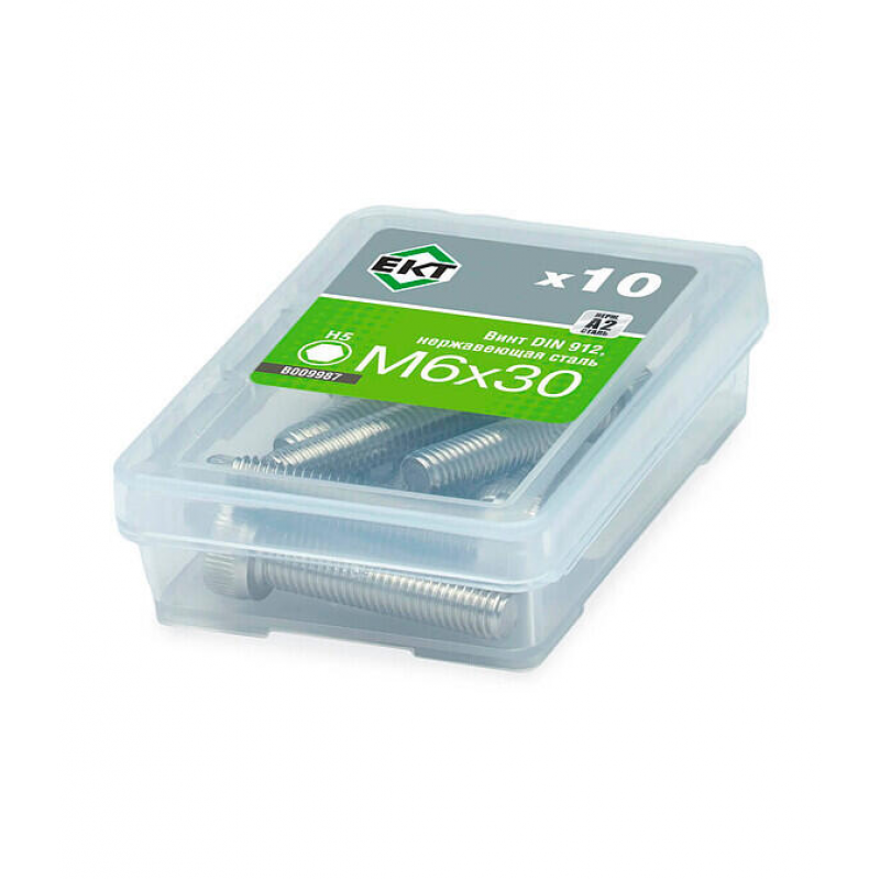 Коррозионная стойкость нержавеющей стали, надежное крепление благодаря внутреннему шестиграннику, соответствие промышленному стандарту DIN 912, удобная упаковка для хранения.