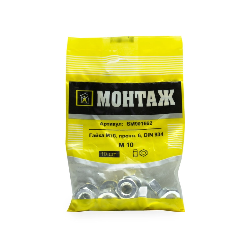 Гайка шестигранная М10 из оцинкованной стали. Класс прочности 6, соответствует стандарту DIN 934. Поставляется в упаковке по 10 штук. Производитель: ООО «ЕКТ Компани», Беларусь. Вес упаковки: 0.11 кг. Отгрузка кратно 20 упаковкам.