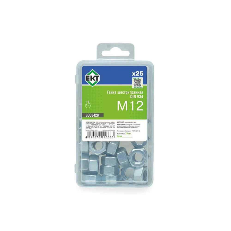 Гайка шестигранная М12 из оцинкованной стали. Класс прочности 8. Соответствует стандарту DIN 934. Упакована в пластиковый контейнер по 25 штук. Бренд: ЕКТ. Производитель: ООО «ЕКТ Компани», Беларусь.