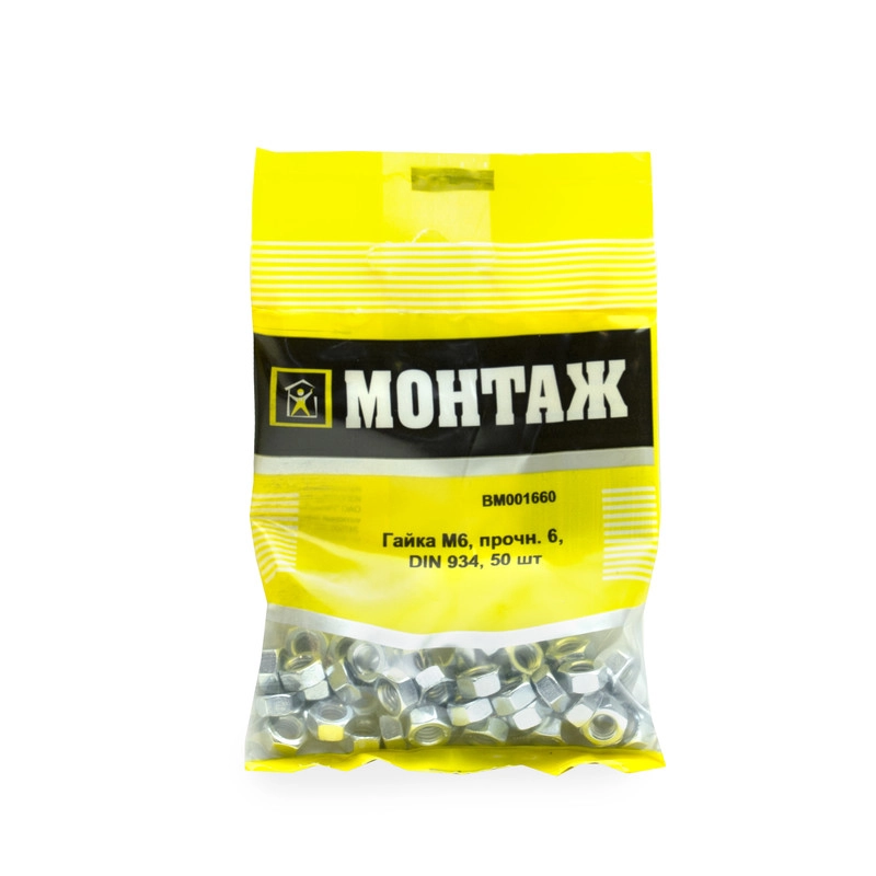 Гайка шестигранная М6 из оцинкованной стали. Класс прочности 6, соответствует стандарту DIN 934. Упаковка содержит 50 штук. Произведено ООО «ЕКТ Компани» в Беларуси.