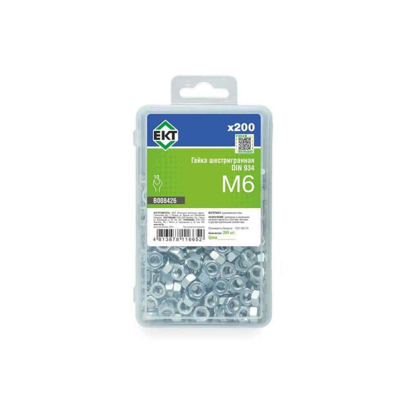 Гайка шестигранная M6, изготовленная из оцинкованной стали. Соответствует стандарту DIN 934, класс прочности 8. Упакована в пластиковый контейнер (200 шт). Бренд: ЕКТ. Производитель: ООО «ЕКТ Компани», Беларусь.