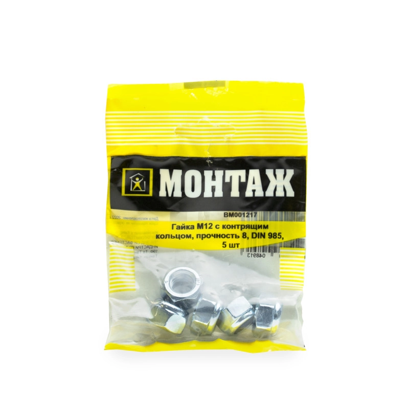 Гайка М12 с контрящим кольцом DIN 985. Изготовлена из оцинкованной стали, класс прочности 8. Упаковка содержит 5 штук. Производитель: ООО «ЕКТ Компани».