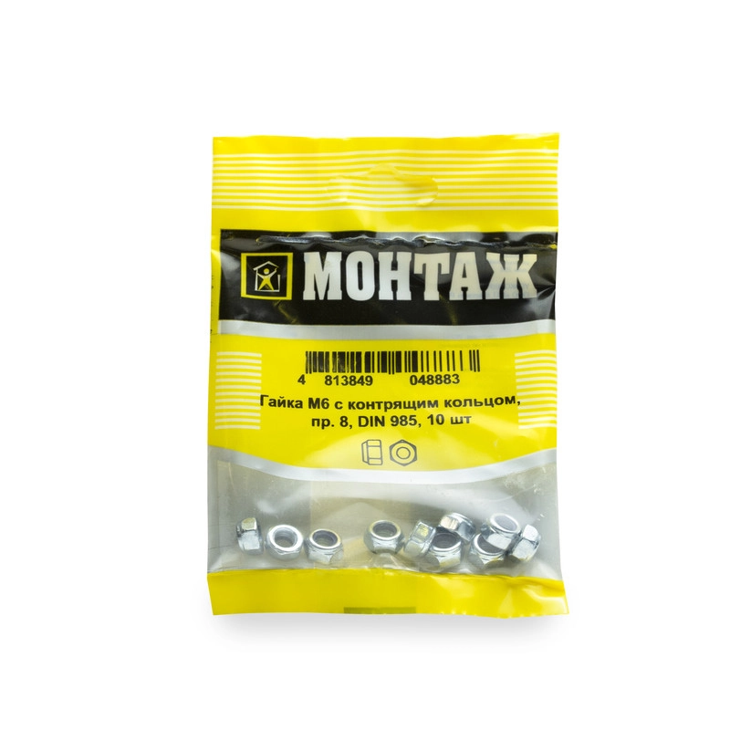 Гайка М6 с контрящим кольцом, DIN 985. Материал: оцинкованная сталь. Класс прочности 8. Упаковка: 10 шт.