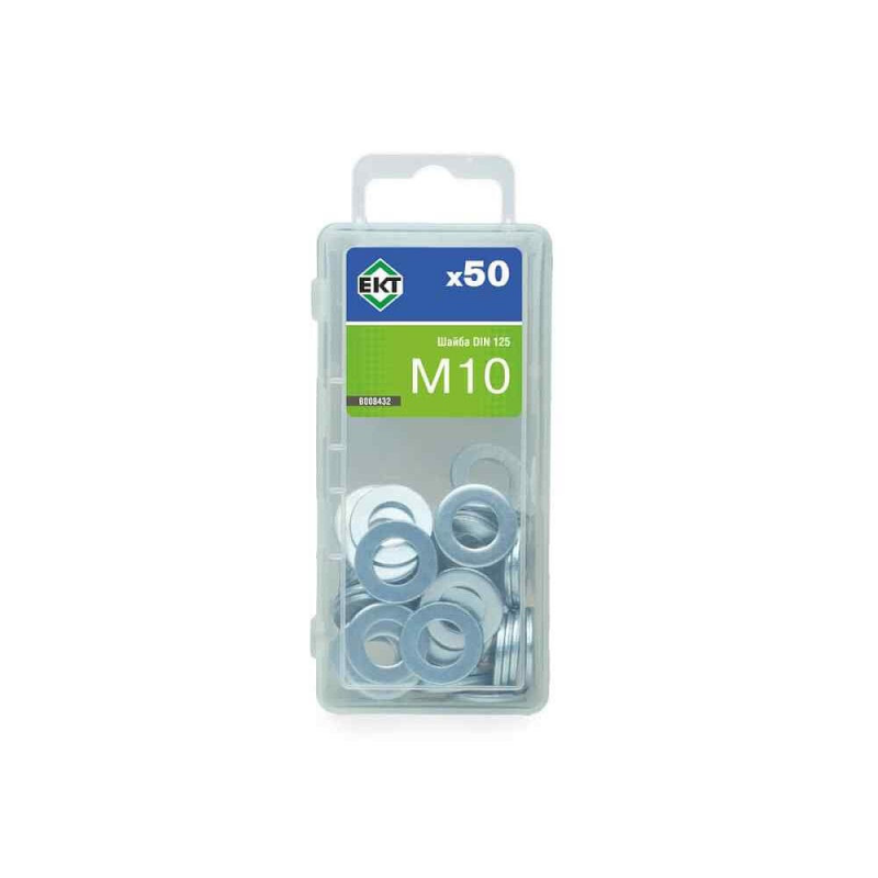 Плоская шайба М10 из оцинкованной стали. Соответствует стандарту DIN 125. Упакована в пластиковый контейнер (50 шт/уп). Производитель: ЕКТ.